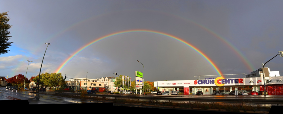 Das weiße Licht der Sonne ist nicht einfach weiß. Das kann jeder unmittelbar bei einem Regenbogen erleben, denn bei diesem Himmelsphänomen wird das Sonnenlicht in seine Spektralfarben aufgespalten. Dabei schaut man als Beobachter mit der Sonne im Rücken auf eine Regenfront. Das Licht der Sonne wird in den Regentröpfchen reflektiert und je nach Wellenlänge unterschiedlich stark gebrochen. Der Bogen bildet sich immer in einer charakteristischen Größe, weil nur diese in ihre Farben aufgespaltenen Lichtstrahlen der Sonne unser Auge erreichen. Wer genau hinschaut, der sieht, dass es auch einen sichtbaren Nebenregenbogen geben kann, der die Farben in umgekehrter Reihenfolge wiedergibt.