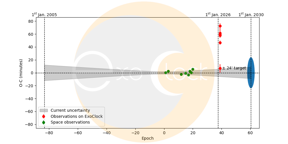 Eine andere Möglichkeit ist allerdings auch, dass sich im System des Sterns TOI-1859 etwas ereignet hat, dass diese Veränderung bewirkte. Diese starke Abweichung von den aus der Literatur entnommenen Transitdaten veranlasste das Exoclock-Team aber unmittelbar, den Status von TOI-1859b von „High“ auf „Alert“ zu setzen. Das bedeutet, dass sehr dringend weitere Messungen benötigt werden, um dieses Ergebnis zu verifizieren. Diese Transitzeiten sollen nämlich beim für 2030 geplanten Ariel-Satelliten eine exakte Planung der Beobachtungszeiten ermöglichen [9]. Eine Stunde Abweichung wäre eine sehr teure Abweichung für dieses weltraumgestützte Exoplaneten-Beobachtungsprogramm.