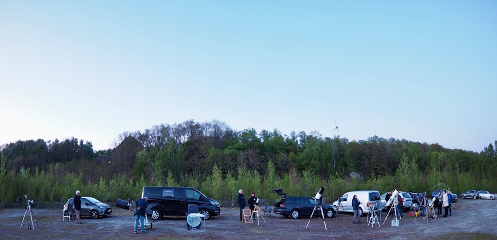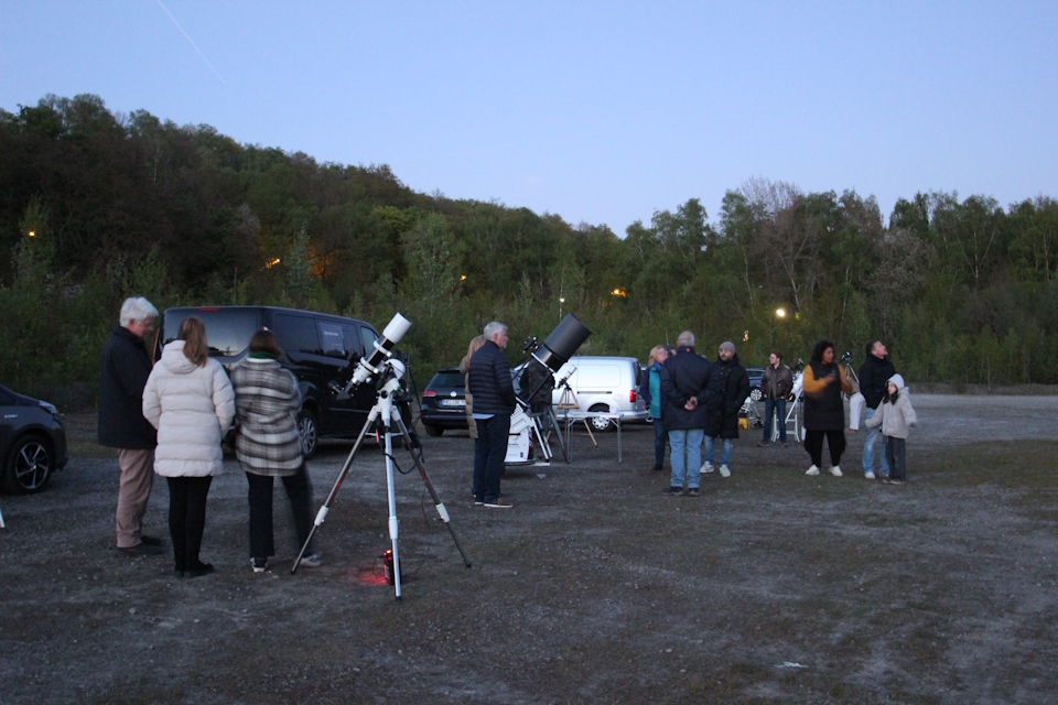 Unten sind die Sternstunden auf der Vosslinke in vollem Gange. Um 21 Uhr waren sie planmäßig gestartet. Da war es noch recht hell. Das Sternstundenteam von kosmos-os hatte bereits seinen ansehnlichen Gerätepark aufgebaut. Vom kleinen Linsenteleskop bis zum sehr großen Spiegelteleskop erwartete die Besucher eine große Bandbreite an Beobachtungsmöglichkeiten. Über 20 Besucher waren gekommen, groß und klein, alt und jung.