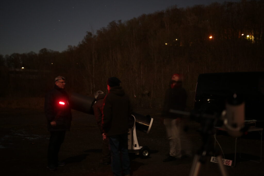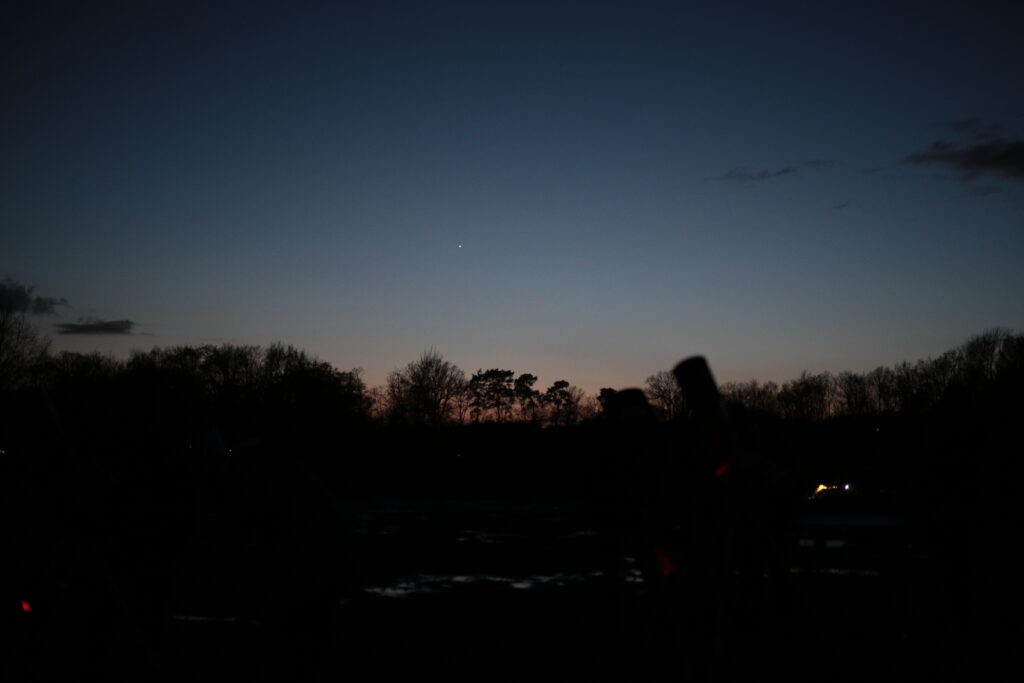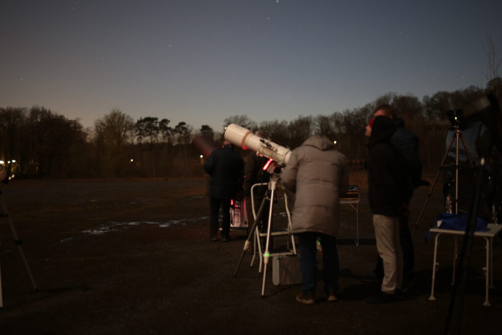 Am Mond waren der „Goldene Henkel“ und diverse Besonderheiten in verschiedenen Teleskopen zu bewundern. Die Venus stand sehr tief am Horizont und sorgte für einen stimmungsvollen Abendhimmel. Der „Große Rote Fleck“ auf Jupiter war im 30iger Dobson-Teleskop schön zu sehen. Die Bewegung der Jupitermonde war in den 3 Stunden unserer Beobachtungen deutlich zu beobachten. Doppelsterne und Sternhaufen rundeten das Programm ab. Auch konnten wir einem Neueinsteiger beim Umgang mit seinem Teleskop einige Tipps mit auf den Weg geben.